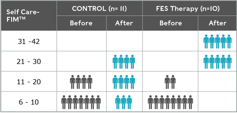 Individuals experiencing upper extremity paralysis due to SCI who underwent 40 hours of FES therapy with MyndMove™ + 40 hours of conventional occupational therapy (COT) over an 8 week period improved significantly more than patients who underwent 80 hours of COT during the 8 week period1,5. The patients were treated 5 days per week over the 8 week period. The difference in the mean change in SCIM self-care subscores from baseline to post treatment was statistically significant for the FES + COT group when compared to the COT only group (P< 0.0001).